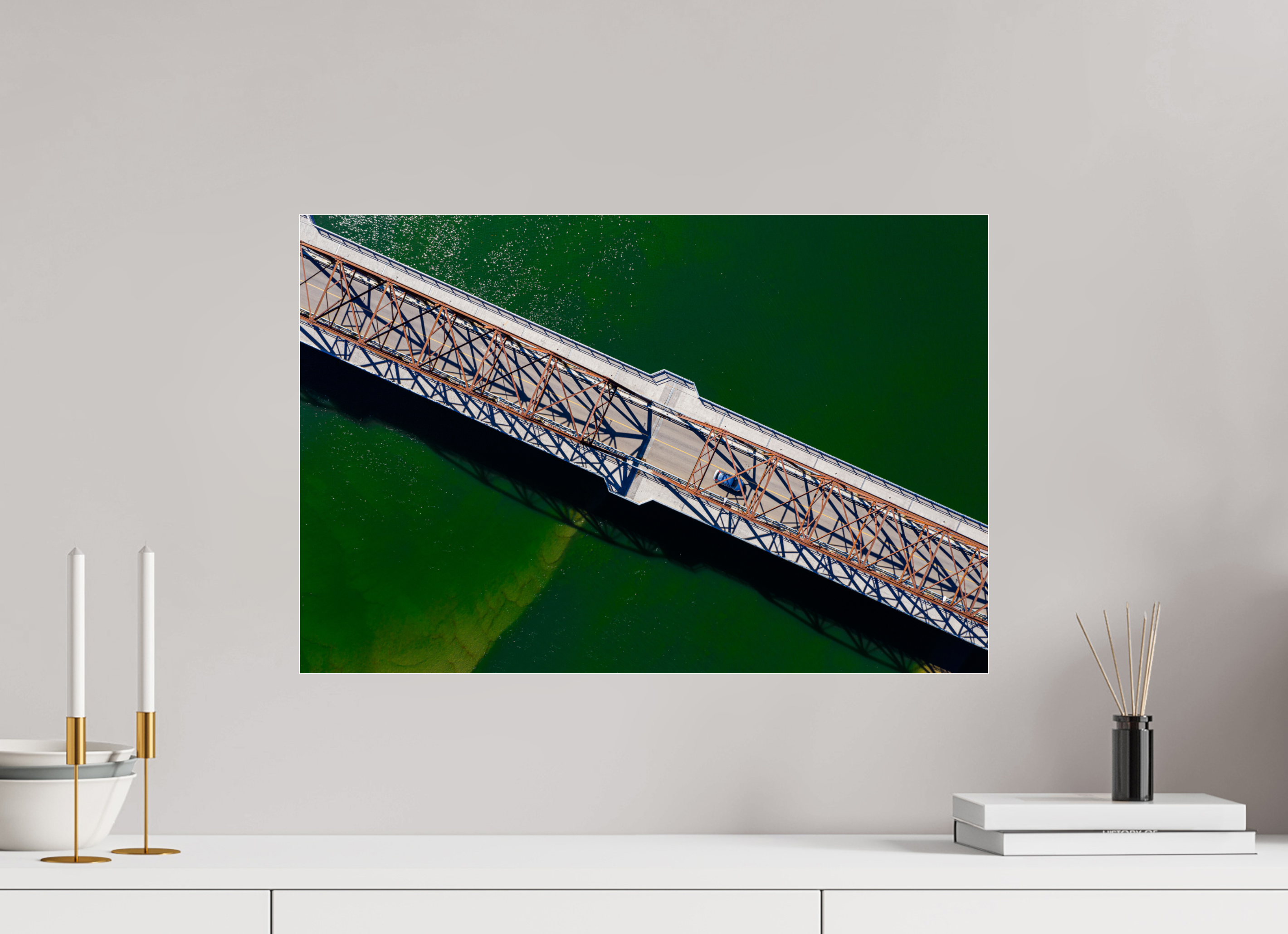 From above, the Traffic Bridge in Saskatoon transforms into a work of art — a study in symmetry, shadow, and movement. The steel trusses cast intricate patterns across the emerald waters of the South Saskatchewan River, while a lone car makes its quiet passage across.