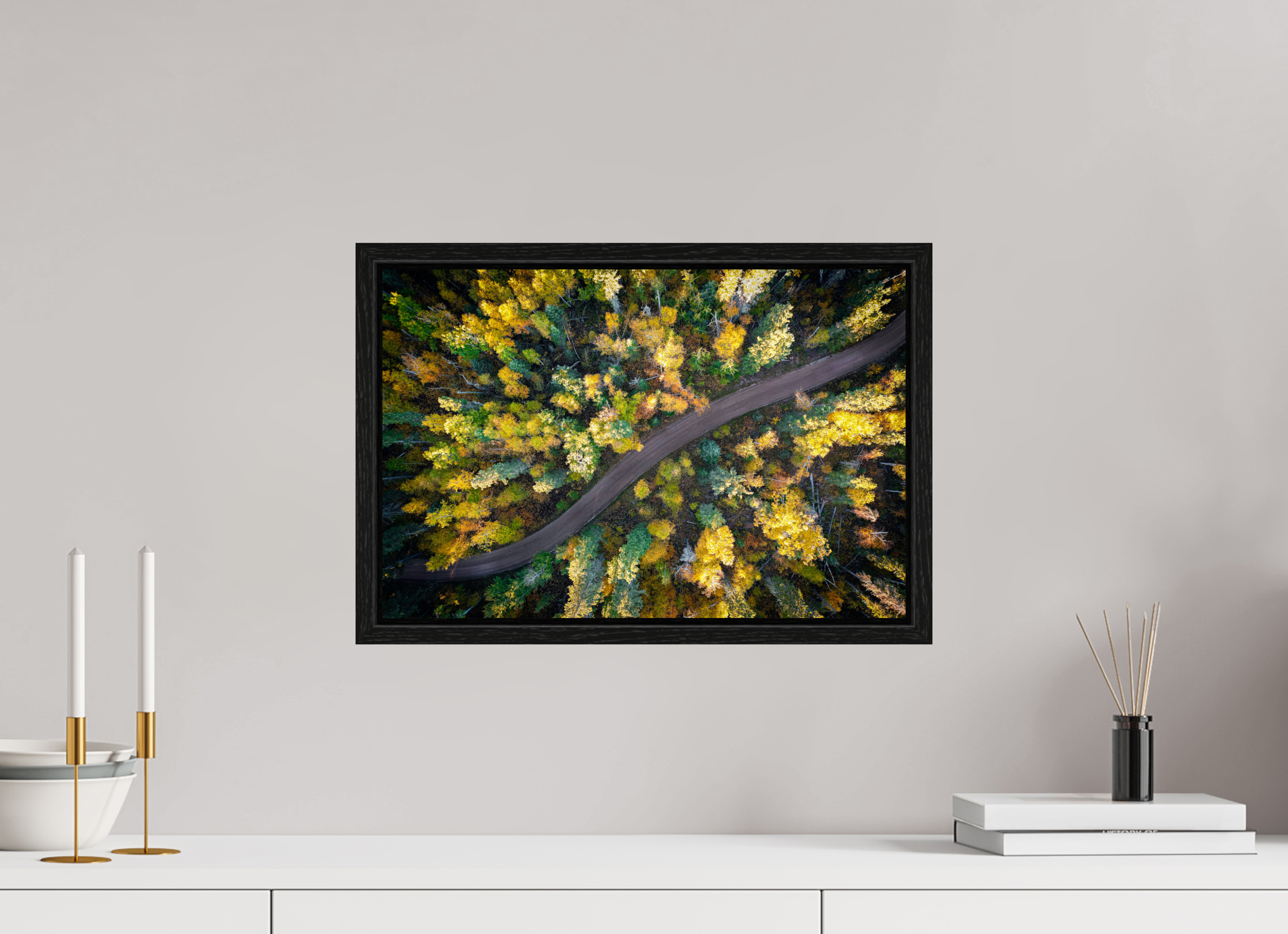 Viewed from above, this landscape becomes both abstract and intimate — a portrait of transition and balance. Each tree glows like a brushstroke of light, and the earthy road, dark and deliberate, carries the eye deep into the rhythm of the forest.