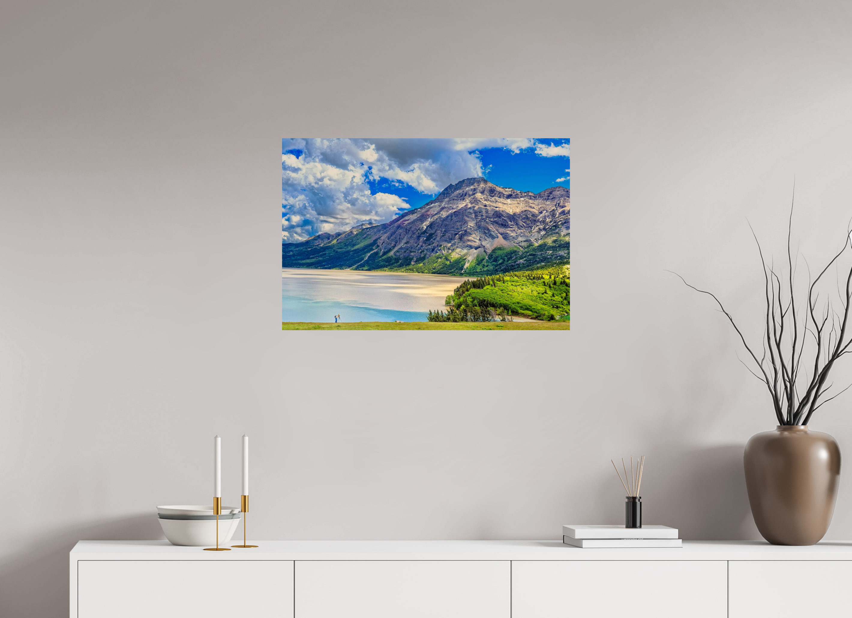 Beneath the Mountain’s Gaze captures the vast serenity of Middle Waterton Lake, where the immense stone face of the Rockies watches over the still waters below. A lone photographer stands at the edge — a small figure in an endless wilderness — reminding us of our fragile scale against nature’s enduring power.