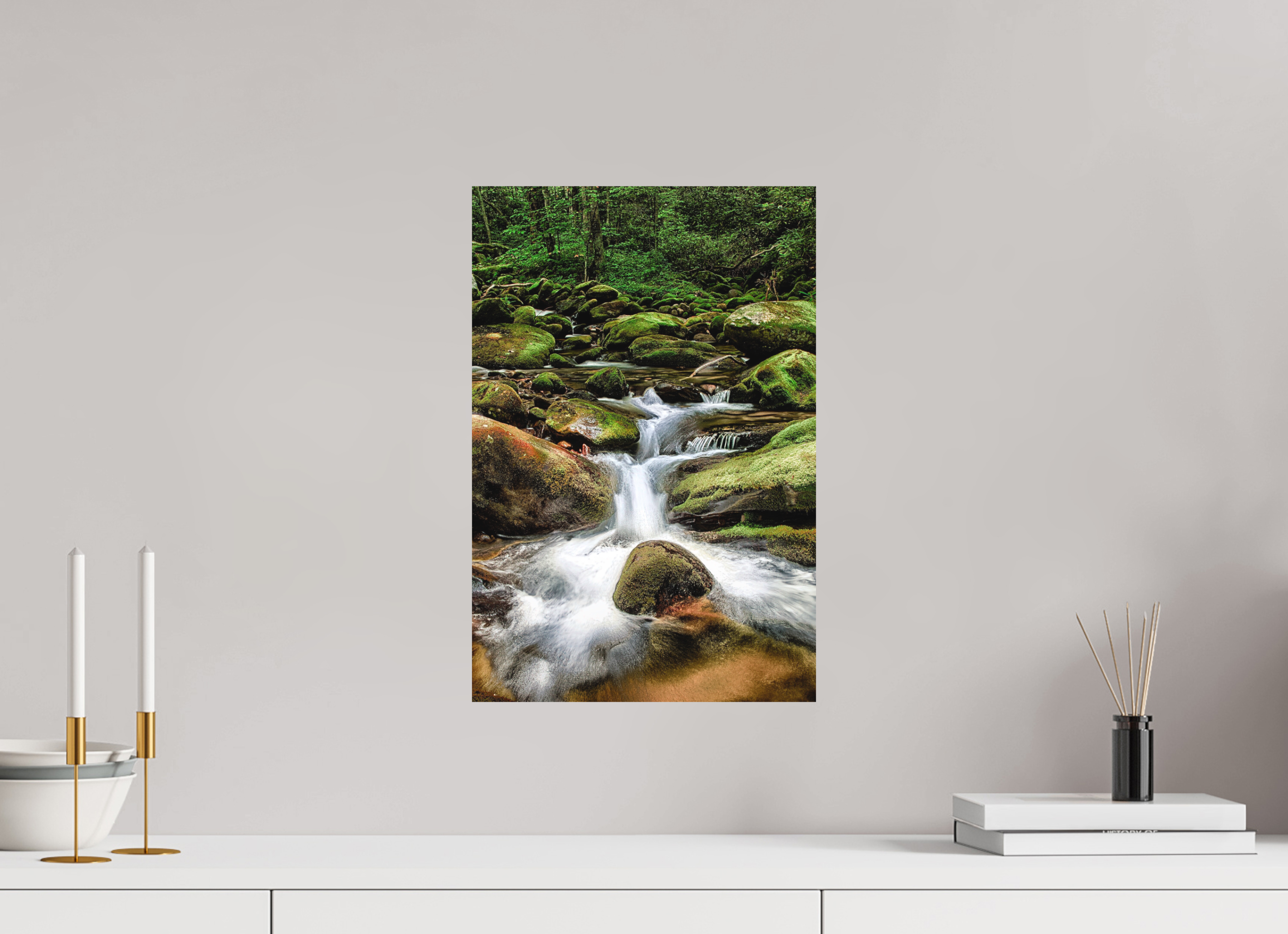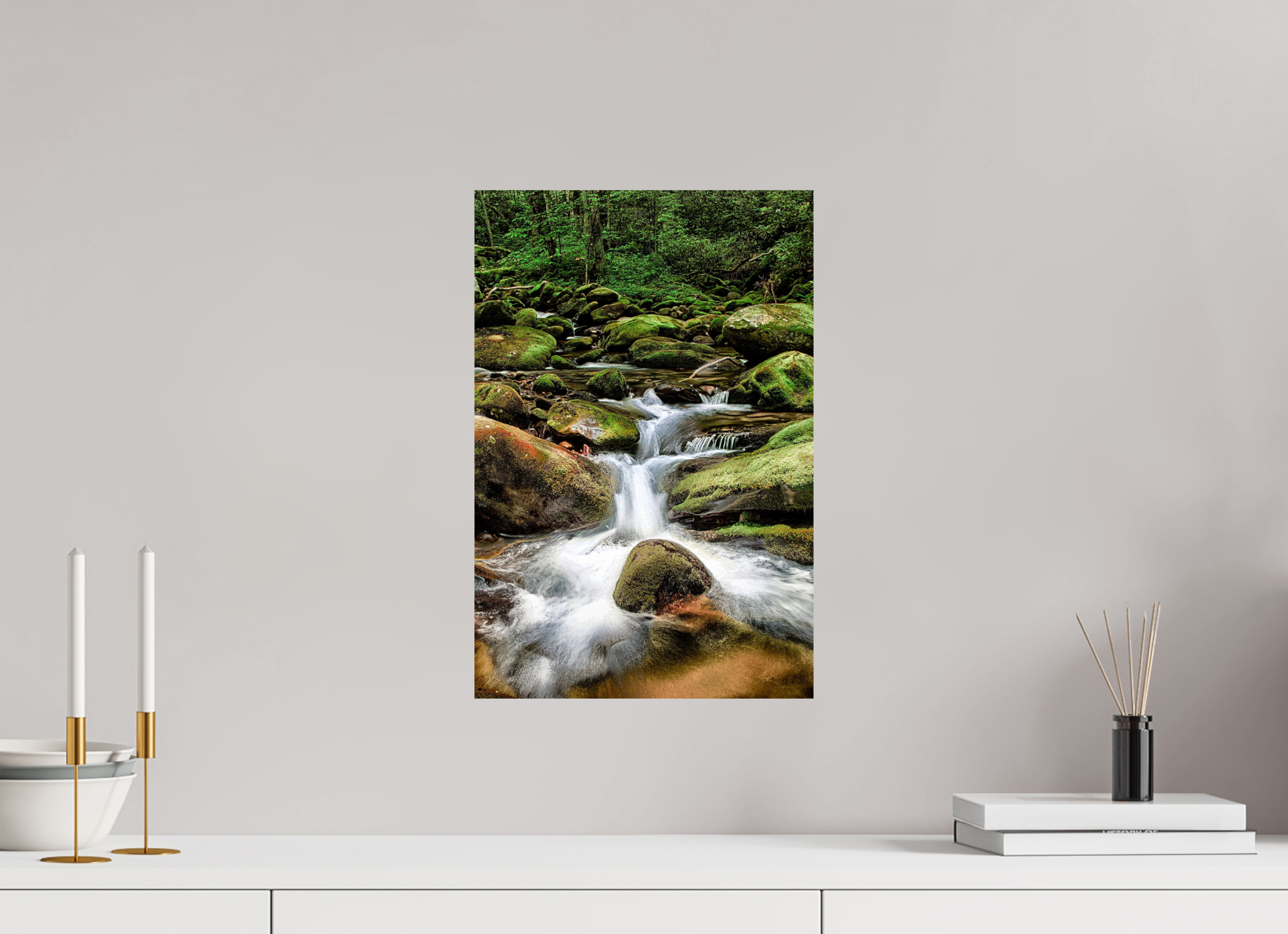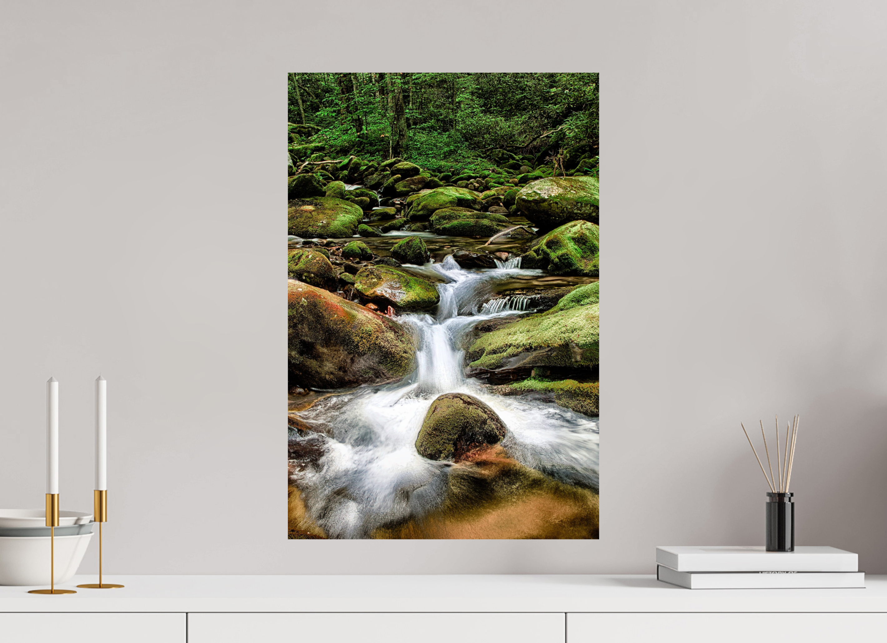 Forest Lullaby captures the soft music of Roaring Fork River, a tranquil stream winding through the heart of Tennessee’s Great Smoky Mountains. Water flows gently over moss-covered stones, weaving a melody of stillness and renewal beneath a canopy of deep green.