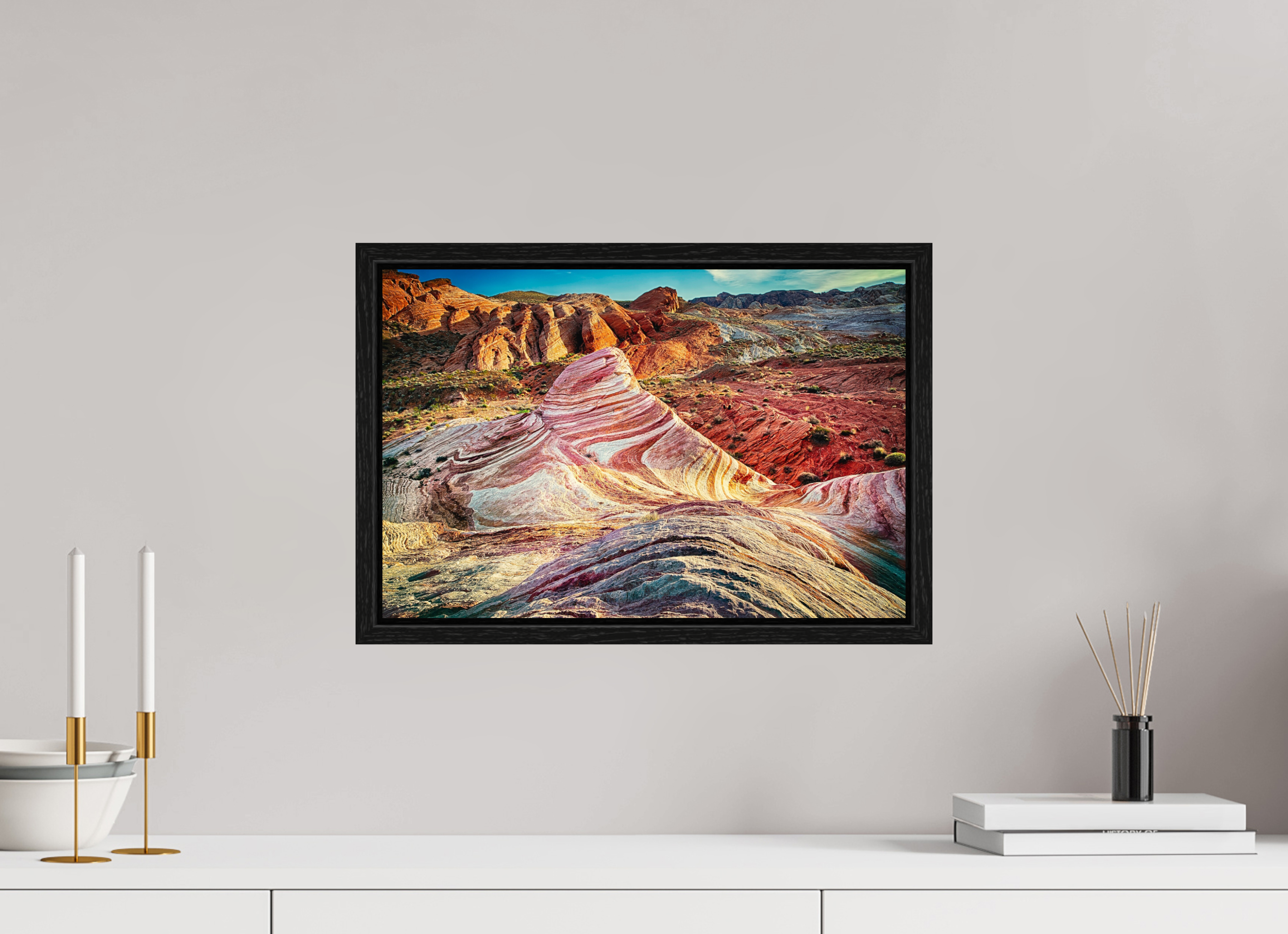 A true photographic print under acrylic glass, mounted in a black oak floater frame for a classic gallery presentation.