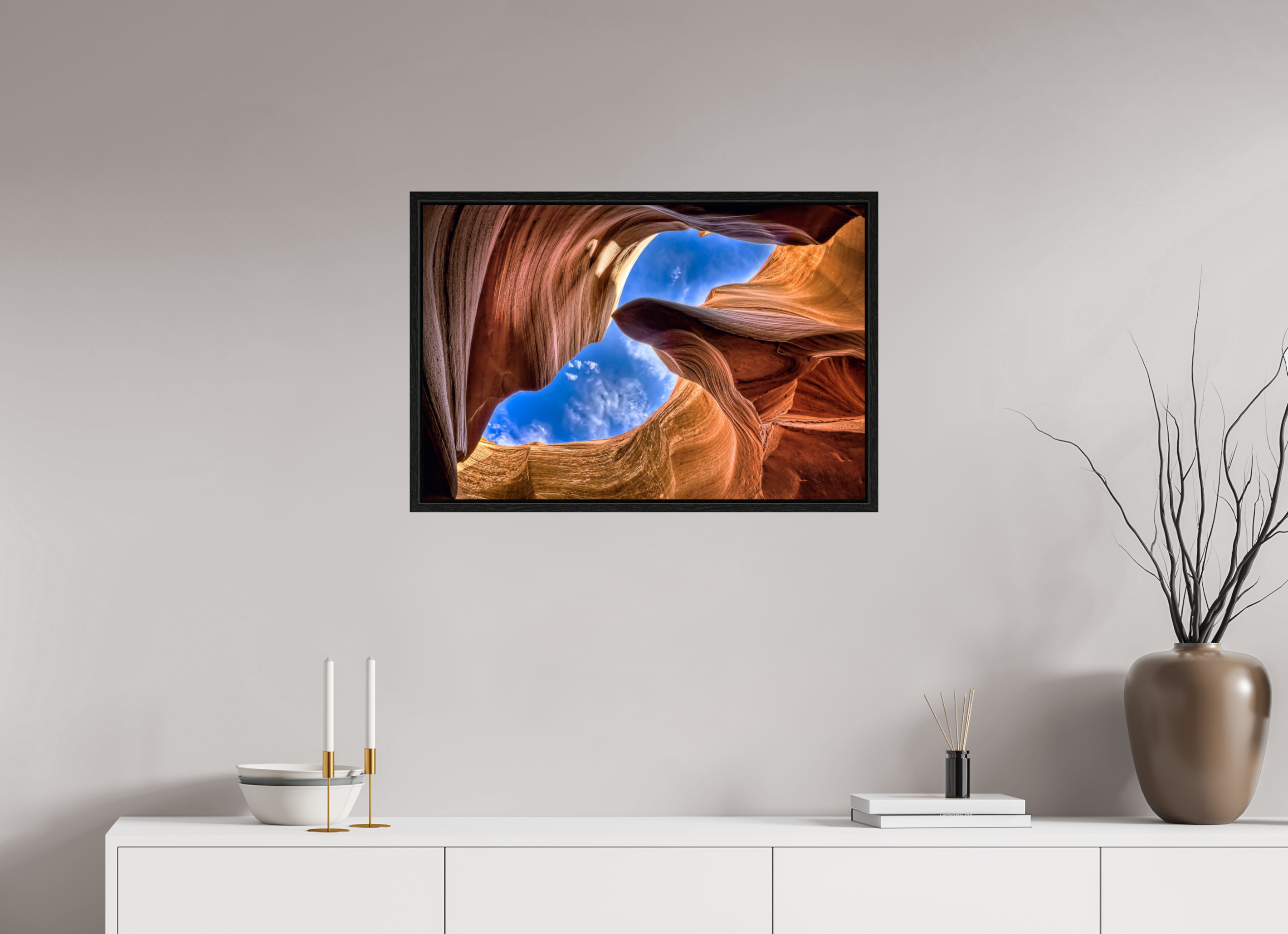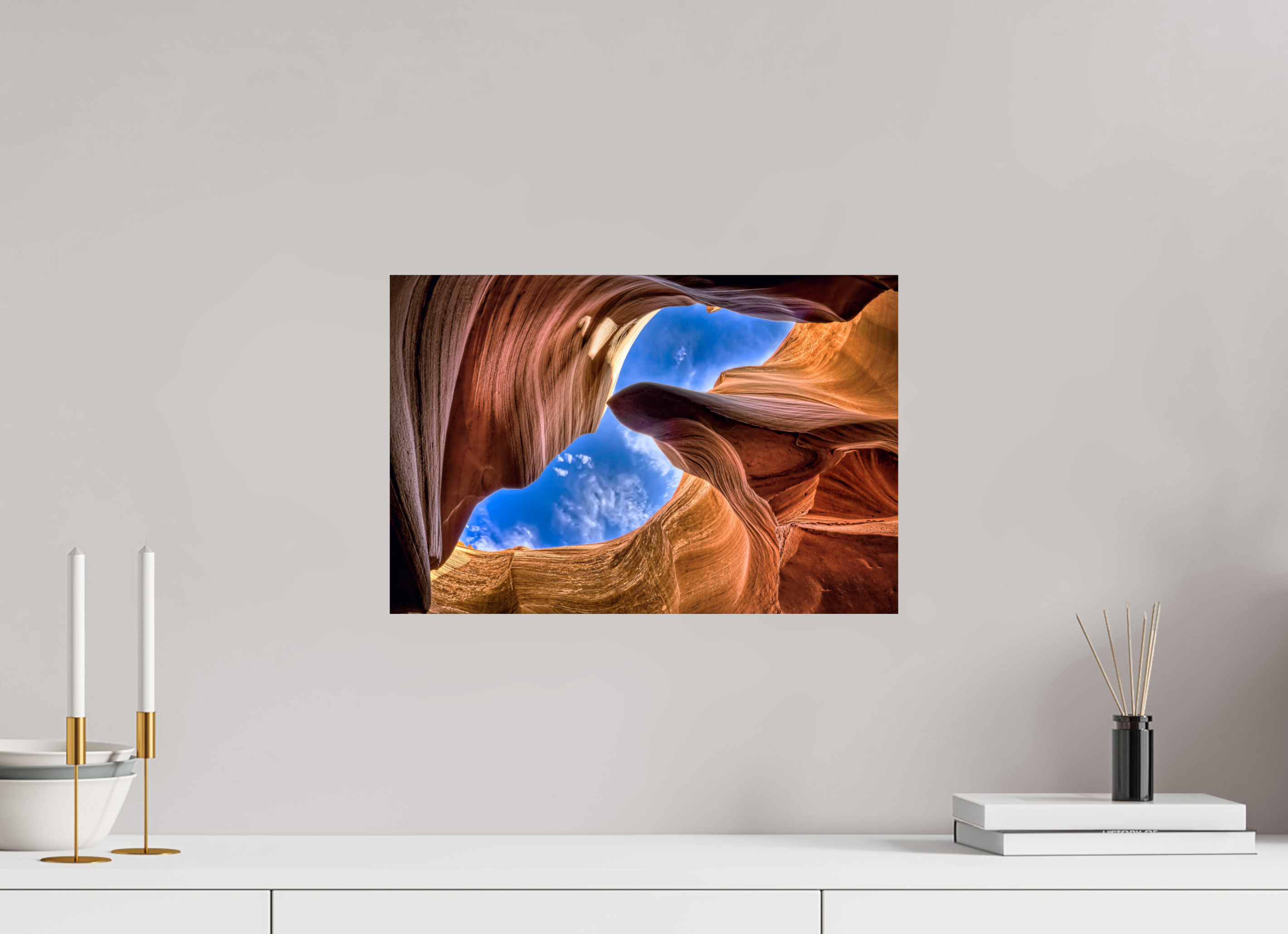 In Window to Infinity, the timeless sandstone walls of Antelope Canyon open skyward, framing a glimpse of endless blue. The curves of the canyon twist and flow like a living sculpture — a masterpiece carved not by hands, but by wind, water, and time itself.