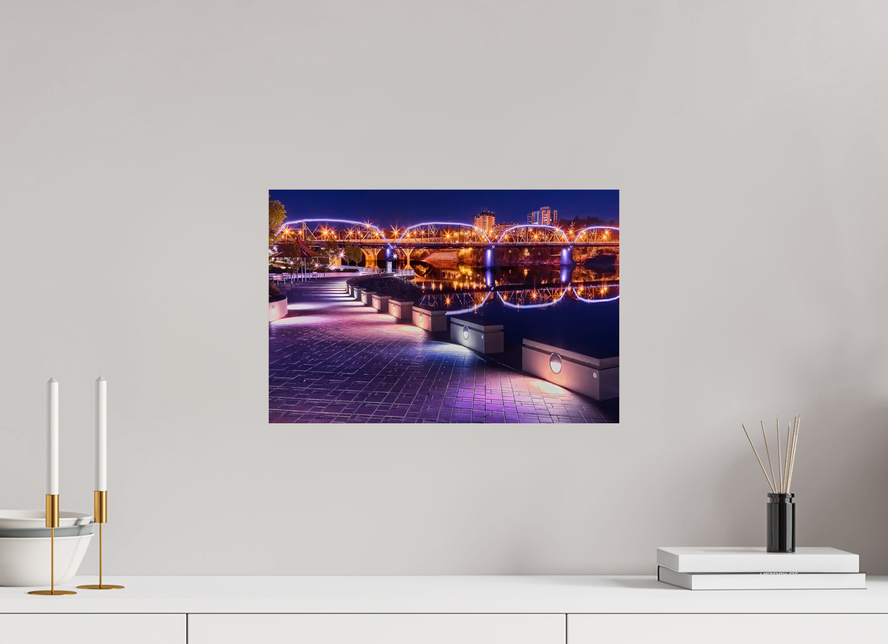 s dusk settles over the South Saskatchewan River, Saskatoon begins to glow with quiet brilliance. The illuminated walkways of River Landing shimmer beneath soft purple and amber light, guiding the eye toward the graceful arches of the Traffic Bridge as they reflect across the still water. The city comes alive in color and reflection—an enchanting blend of calm and energy that defines the heart of downtown Saskatoon.