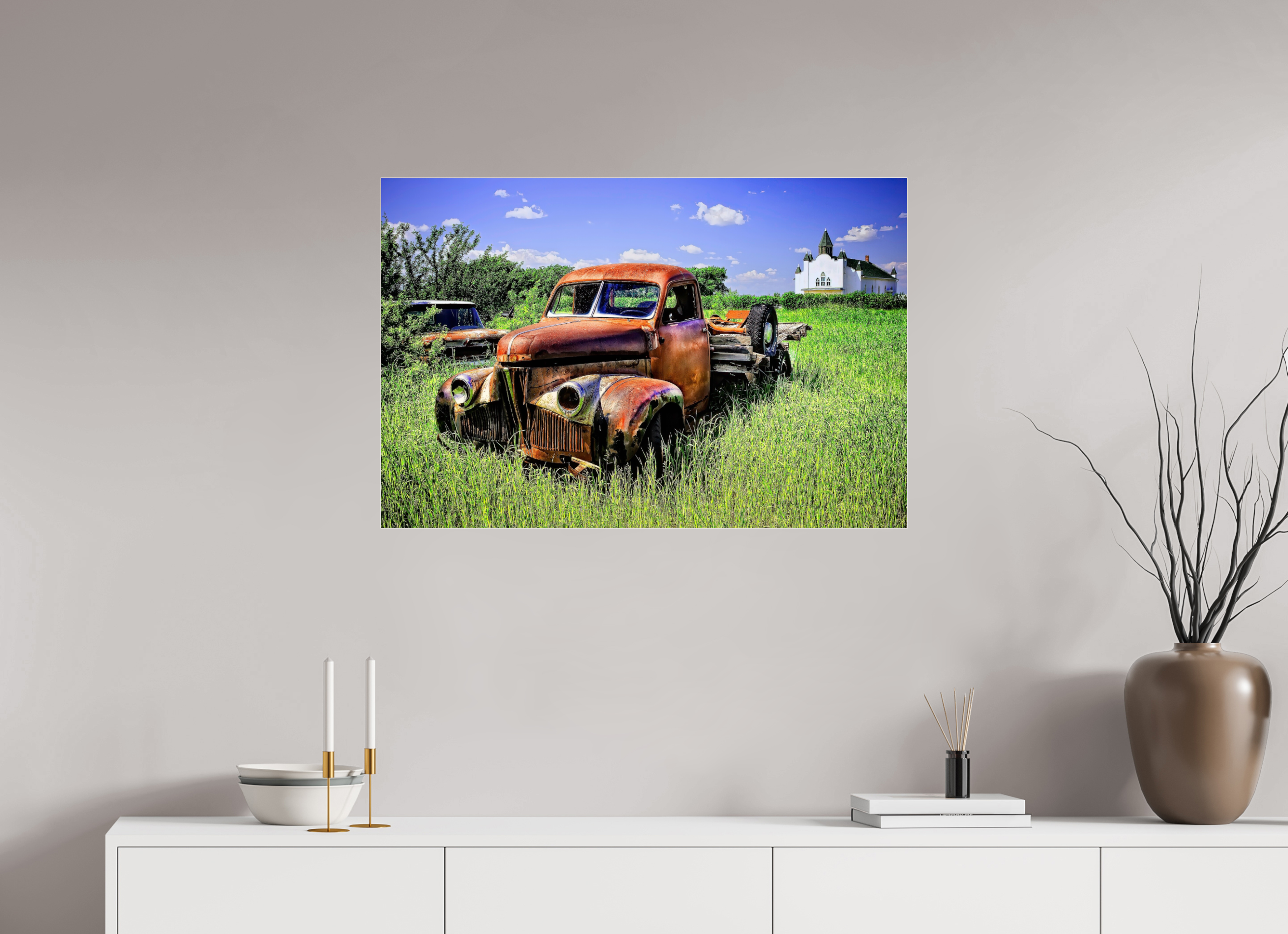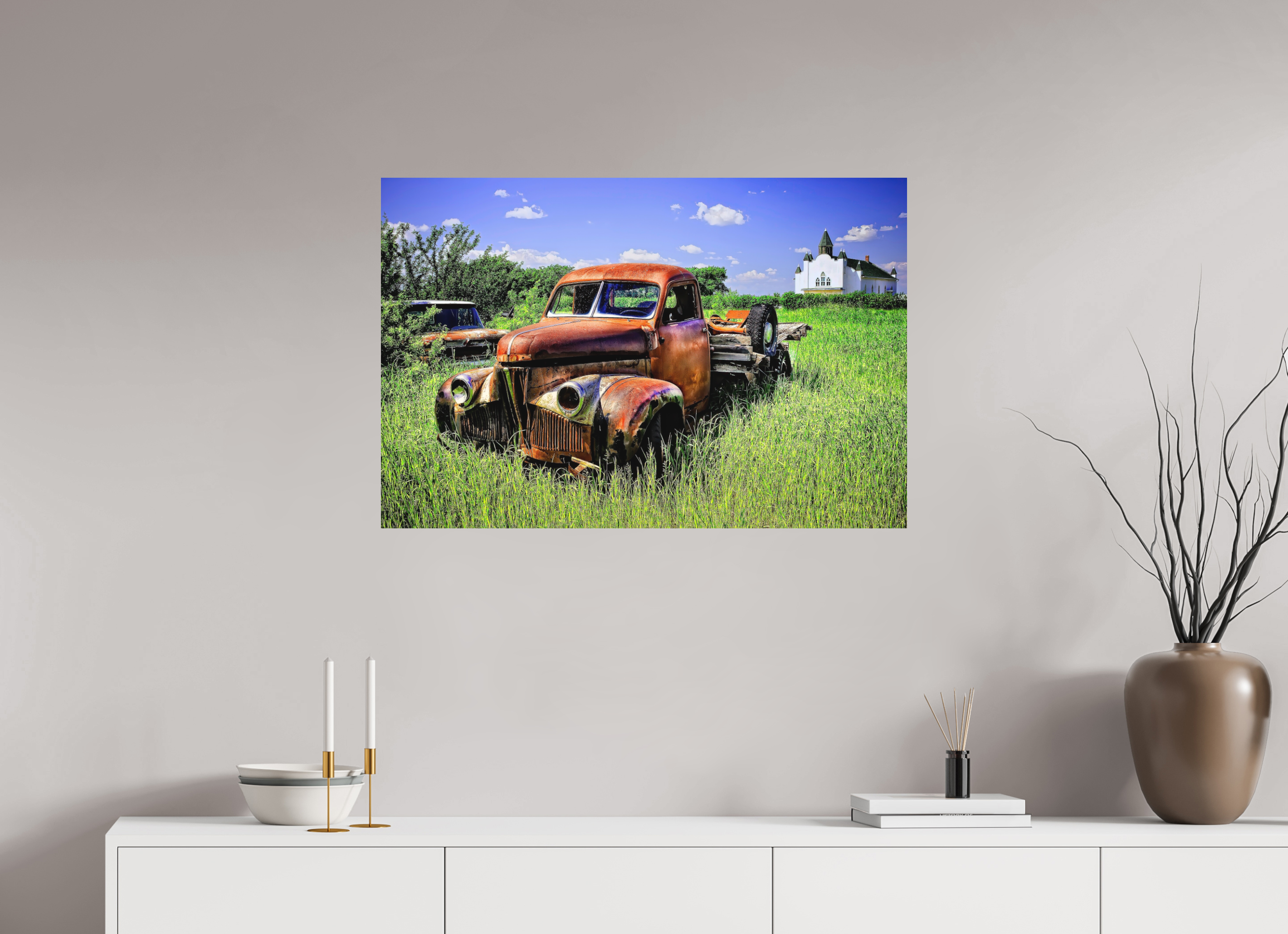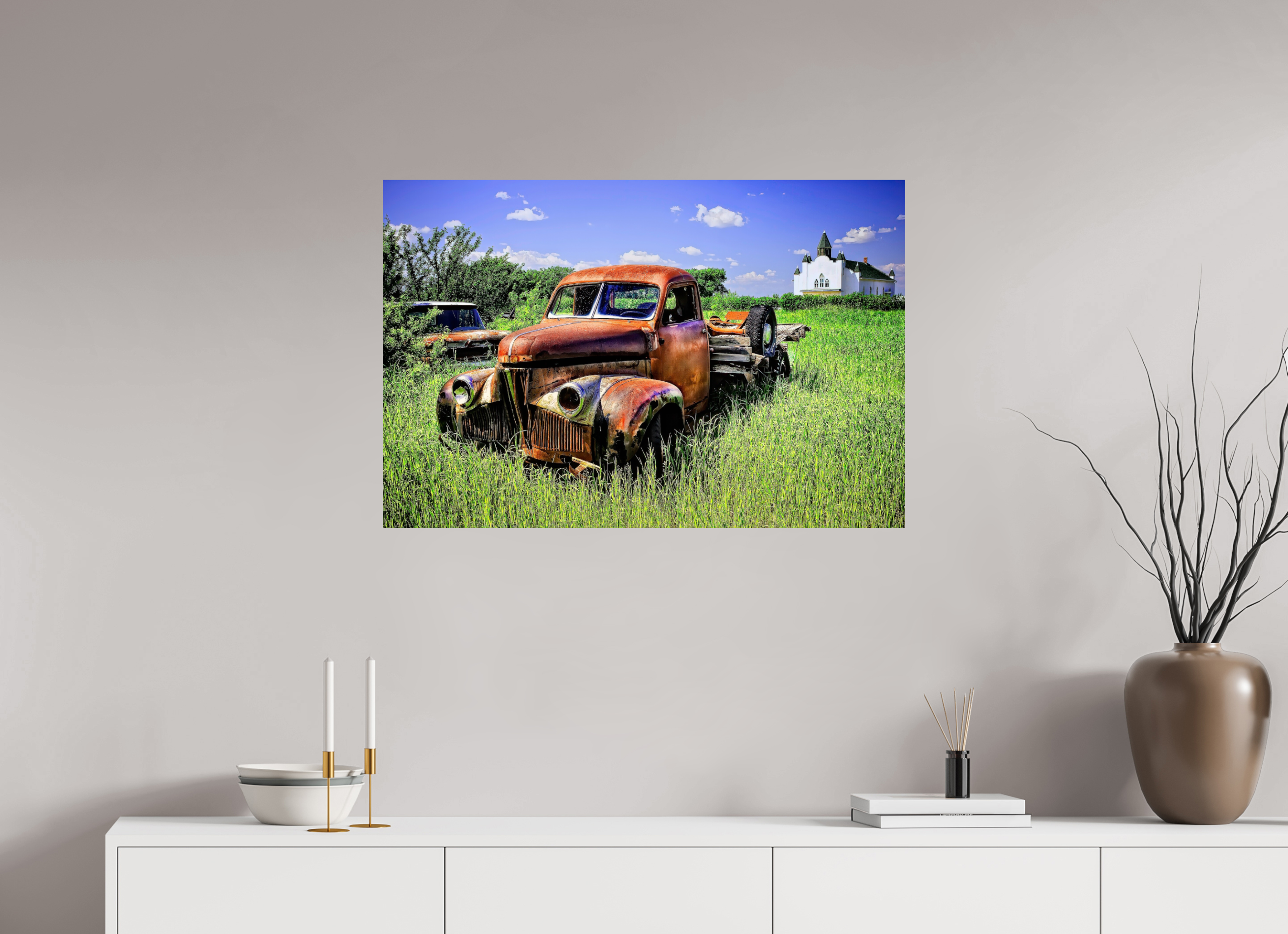 - Visualizing the artwork above key furniture pieces (sofa, bed, dining table, or desk).