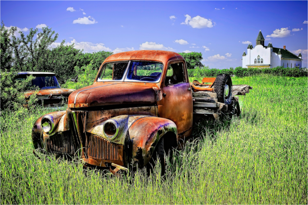 Beneath the open prairie sky, a weathered truck rests beside an old country church — both witnesses to time, faith, and the fading hum of yesterday’s roads.