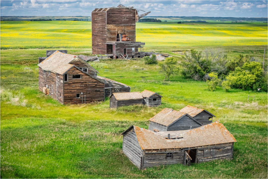 Once a proud landmark rising above the prairie horizon, the historic grain elevator at Bents, Saskatchewan now stands weather-scarred and partially collapsed—its wooden “crown” torn away by decades of relentless prairie wind. This aerial perspective reveals the haunting beauty of the abandoned town below: weathered homes, collapsing barns, and the fading lines of a once-thriving community slowly being reclaimed by the land.